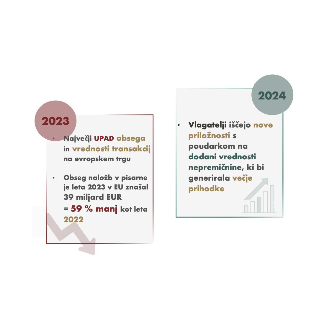 V obdobju 2020-2023 smo na trgu pisarniških prostorov spremljali pojav hibridnega dela, zmanjšano povpraševanje po pisarniških prostorih in posledično upad stopnje zasedenosti kapacitet. Vse je kazalo, da segment izgublja zanimivost in interes investitorjev, namreč vrednost transakcij je v letu 2023 upadla kar za 59 % glede na predhodno leto.