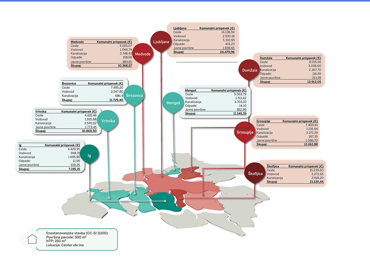 Odgovor je predvsem odvisen od občine v kateri planiramo postaviti hišo. Kot zanimivost sem analizirala višino odmerjenega komunalnega prispevka po izbranih občinah za enostanovanjsko stavbo s površino parcele 500 m2 in NTP 150 m2. Sledeč analizi najvišji komunalni prispevek lahko pričakujemo v Škofljici, najnižjega pa na Igu.