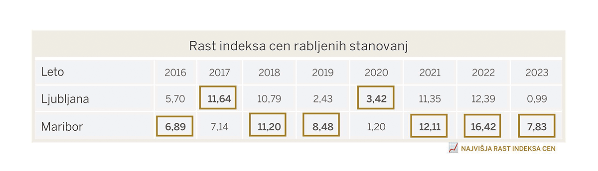 Iz primerjalne analize rasti indeksa cen rabljenih stanovanj v Ljubljani in Mariboru (vir: SURS) je razvidno, da so od leta 2015 najbolj rasle cene rabljenih stanovanj v Mariboru. Višjo rast na letni ravni je Ljubljana dosegla le v letih 2017 in 2020.