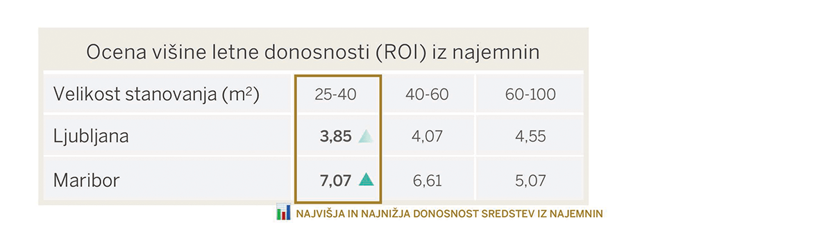 Z vidika donosnosti naložbe, bi od leta 2015 v obliki kapitalskega dobička in donosa iz najemnin največji donos dosegli z nakupom rabljenega manjšega (25-40 m2) stanovanja v Mariboru.