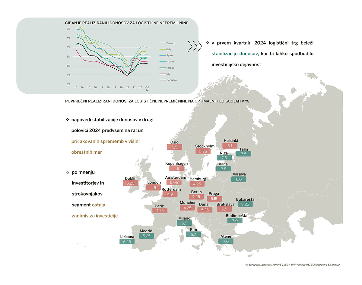 Omenjena stabilizacija donosov na logistične nepremičnine bi lahko v prihodnosti spodbudila ponovno investicijsko dejavnost, zlasti ob pričakovanih spremembah obrestnih mer. Po mnenju strokovnjakov in investitorjev bo segment logistično-skladiščnih prostorov kljub stabilizaciji ostal zanimiv za investiranje. V spodnjem grafu prikazujemo povprečne relizirane donose na logistične nepremičnine na optimalnih lokacijah po posameznih evropskih državah.